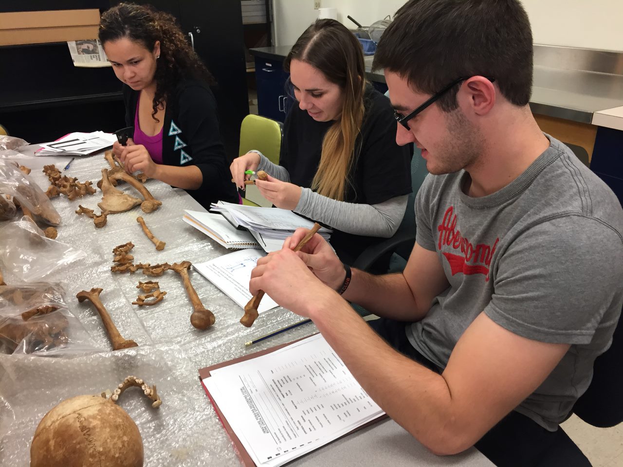 Students examining bones from a skeleton